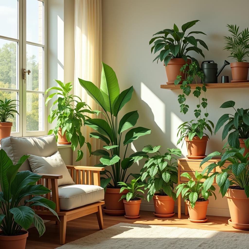 Realism photograph of a cozy living room filled with a variety of low light indoor plants such as Snake Plant, Pothos, and ZZ Plant. The room features natural wooden furniture, soft pastel walls, and warm sunlight filtering through sheer curtains, casting gentle shadows over the plants. A watering can and gardening tools are visible on a wooden shelf, underscoring the indoor gardening theme. The lush arrangement creates a tranquil atmosphere.