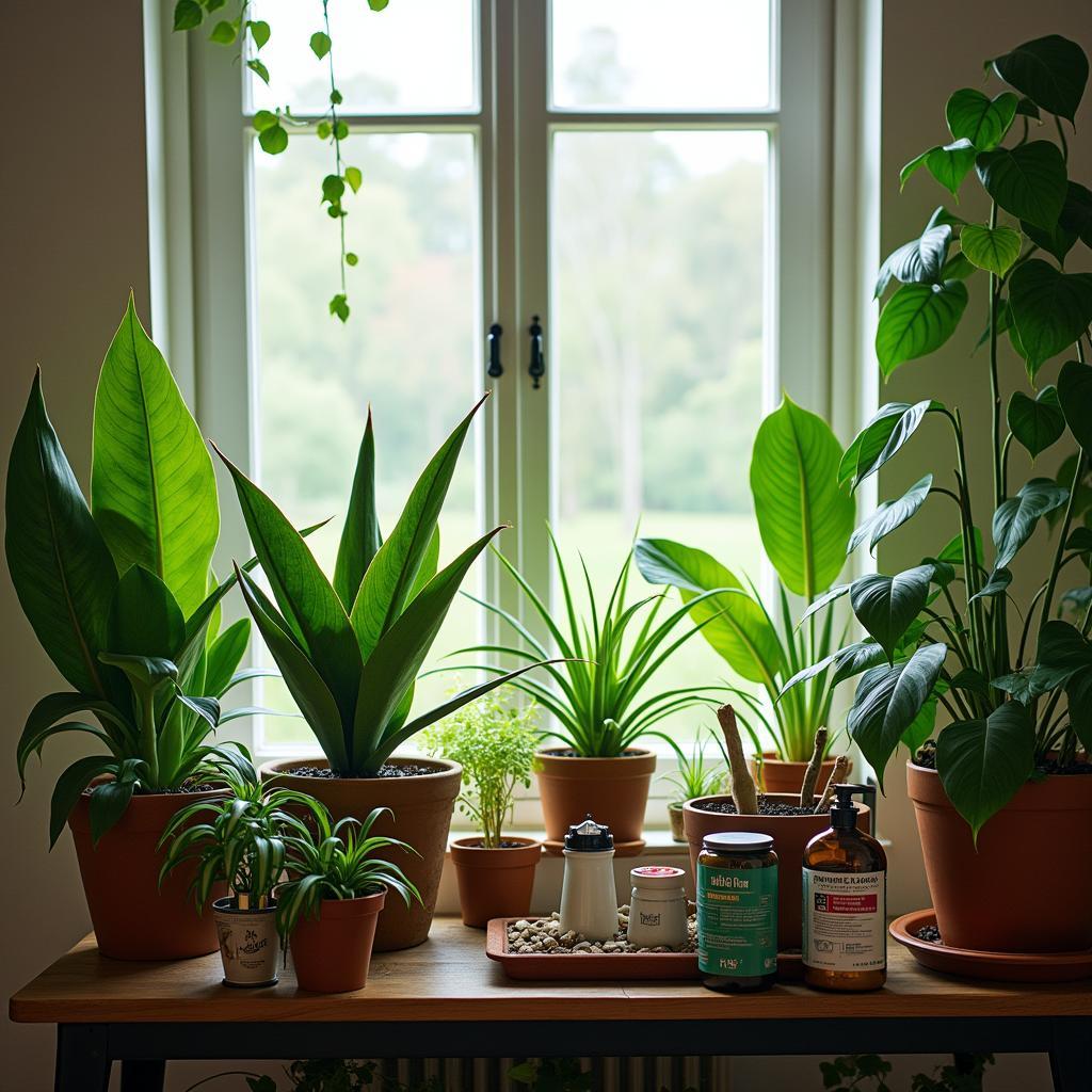 A realism photograph of a serene indoor garden, showcasing a variety of healthy plants such as Snake Plants and Pothos in natural lighting. The setting features a well-organized plant shelf with visible signs of care, like a hygrometer and pest management products nearby, creating an inviting atmosphere for home gardening enthusiasts.