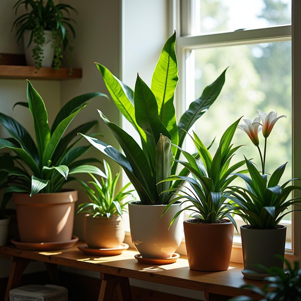 - Peace Lily (Spathiphyllum): Beautiful white flowers and excellent air purifier; prefers low to medium light.