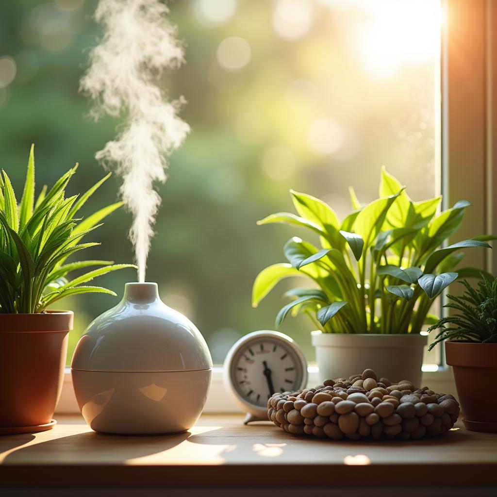 For visual reference, consider capturing an image of a beautifully arranged indoor gardening setup featuring a variety of houseplants in different pots, supplemented by a small humidifier on a pedestal table. The scene should include a hygrometer visibly measuring humidity levels, along with a close-up of a pebble tray in action, creating a vibrant, lush atmosphere. Bright natural light streams in through a window, illuminating the greenery and creating a cozy indoor ambiance, enhancing the illustrative quality of plant care and humidity management.