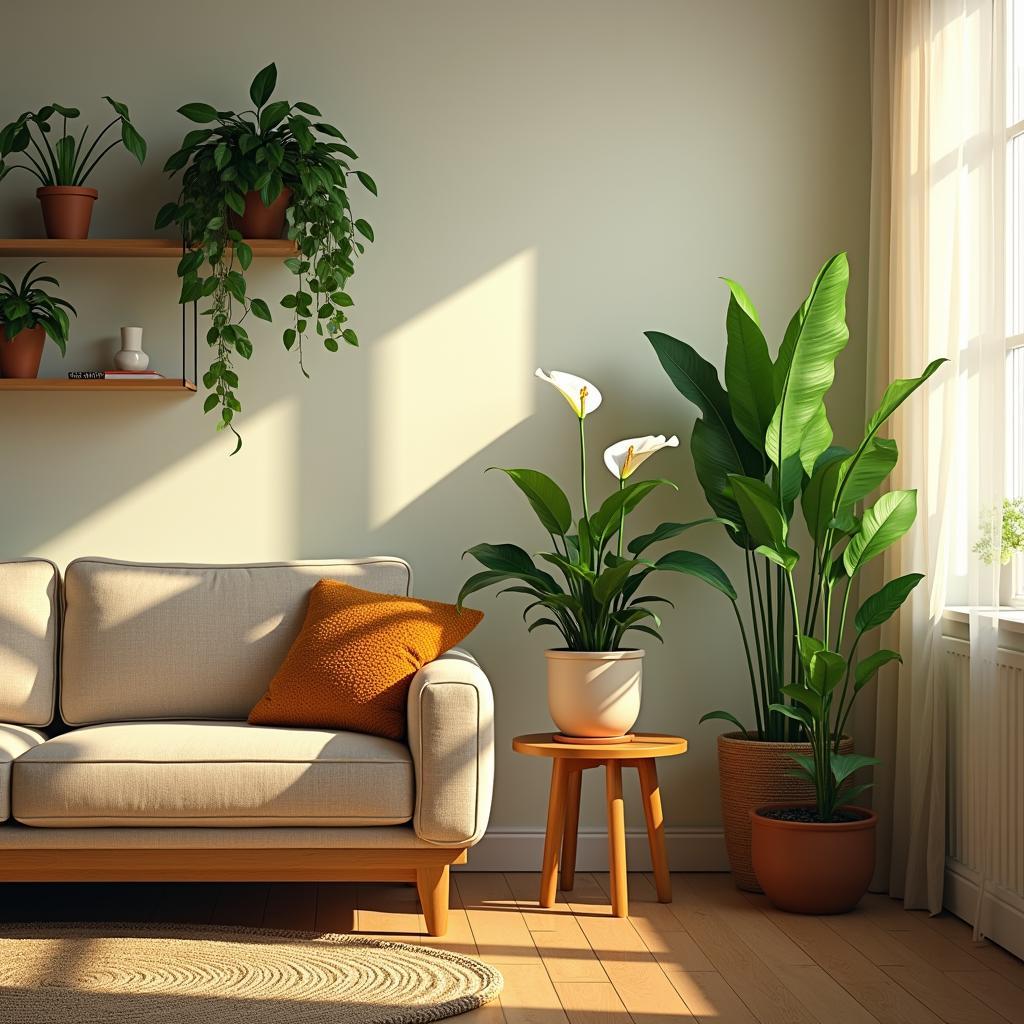 Tip: Use sheer curtains to diffuse harsh sunlight while allowing some light to filter through. A corner shelf system can display plants to catch ambient light effectively.