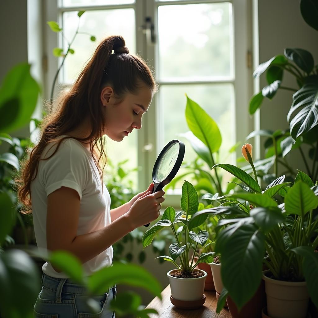 A realism photograph of a bright indoor garden, featuring a variety of healthy houseplants. In the foreground, a person inspects leaves closely for pests using a magnifying glass, surrounded by plants like a peace lily, snake plant, and pothos, with a light pouring in from a nearby window. The setting should convey a sense of tranquility and dedication to nurturing plants, reflecting the beauty of indoor gardening.