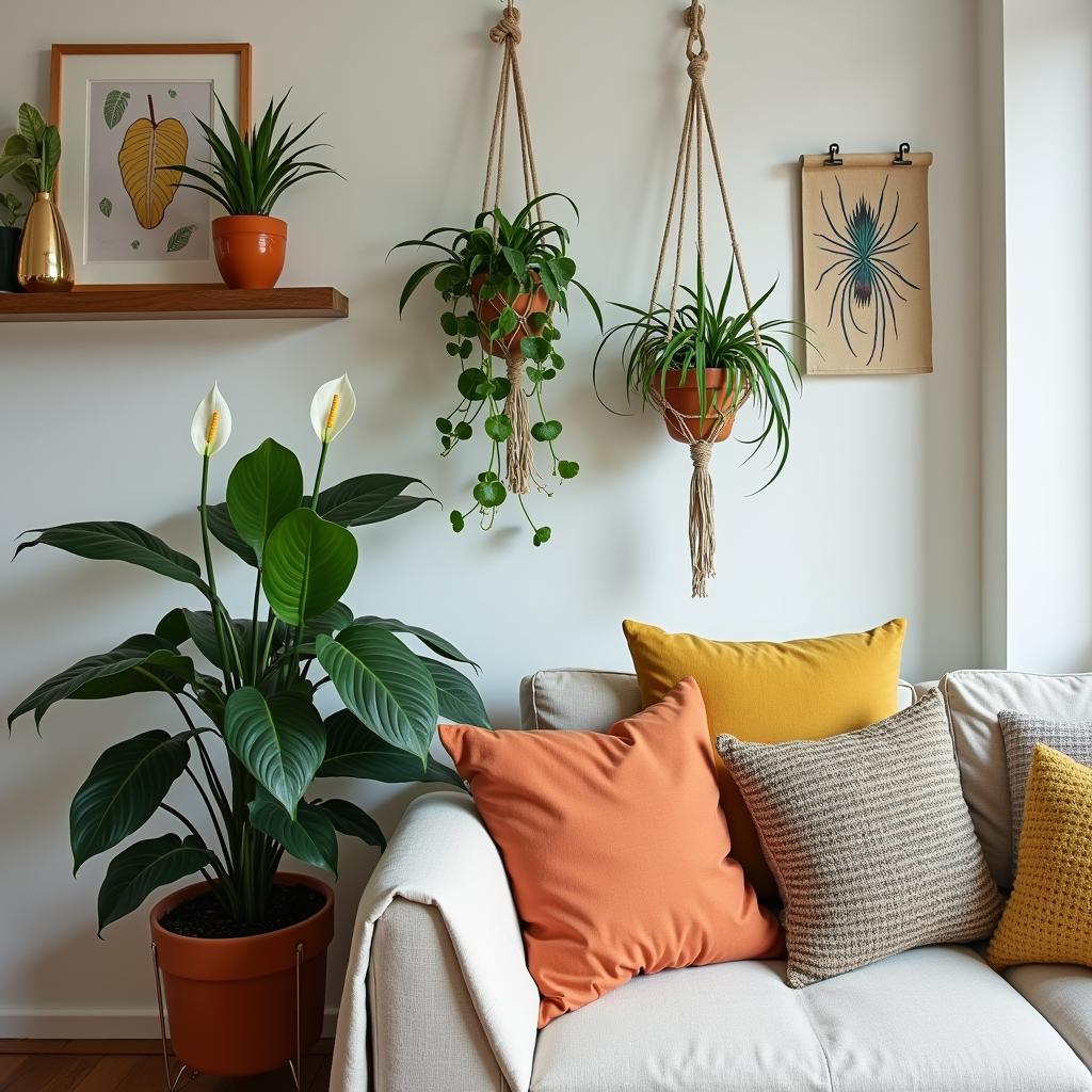 A realism photograph of a small apartment interior featuring a variety of air-purifying indoor plants artfully displayed. The setting includes a corner shelf with a lush peace lily next to a snake plant and a spider plant on a macramé hanger, all surrounded by colorful decor elements like cushions and artwork, showcasing the harmony of nature within a modern living space.