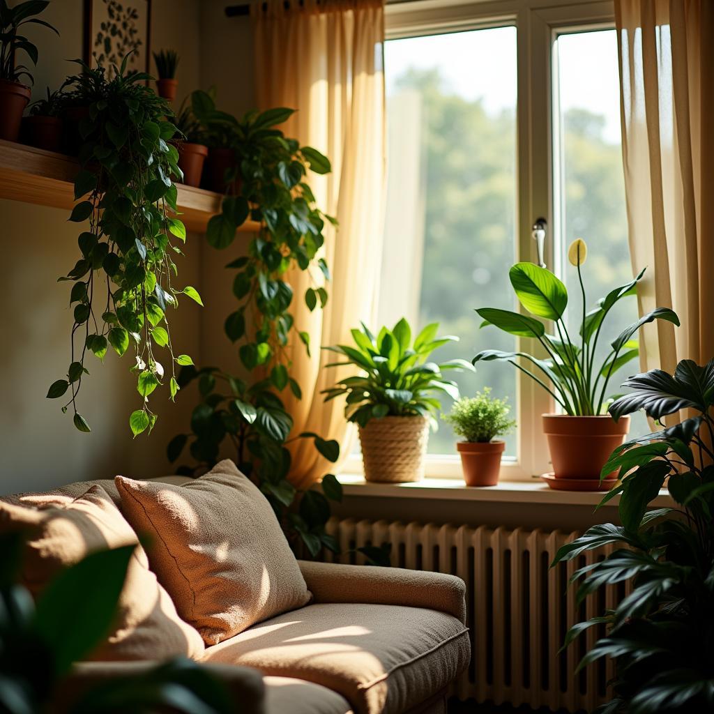 A realism photograph of a cozy small living space featuring several low-light air-purifying indoor plants such as Snake Plants, Pothos hanging from a shelf, and a Peace Lily on a windowsill. The setting should have warm, inviting light with a touch of greenery that brightens the room despite the low-light conditions. There should be a hint of soft textiles, like a cozy couch and a throw, to evoke a sense of comfort and tranquility.