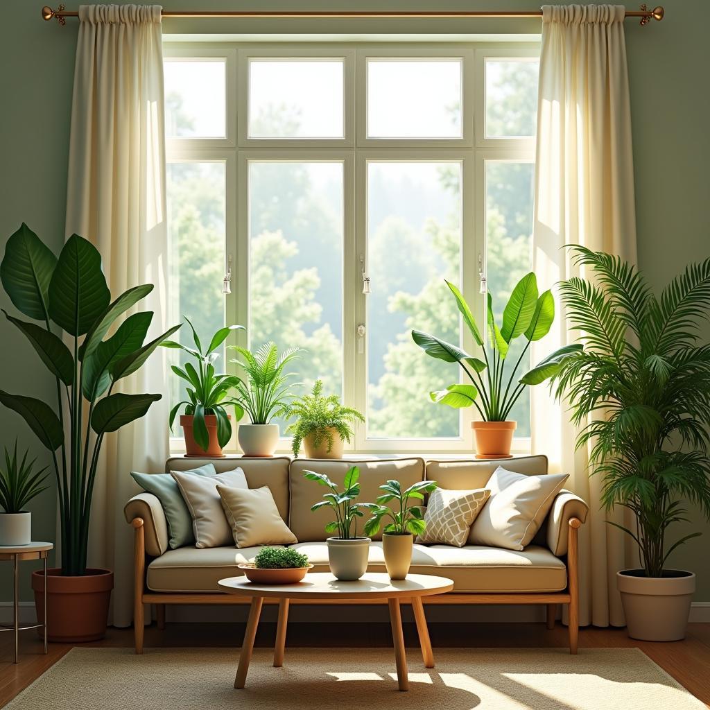 A realism photograph of a cozy living room featuring various air-purifying indoor plants such as a Peace Lily, Spider Plant, and Boston Fern, strategically placed near windows with sheer curtains allowing soft sunlight. The room has a comfortable ambiance, showcasing a vibrant green atmosphere complemented by warm wooden furniture and soft textiles, illustrating the perfect balance of comfort and nature.