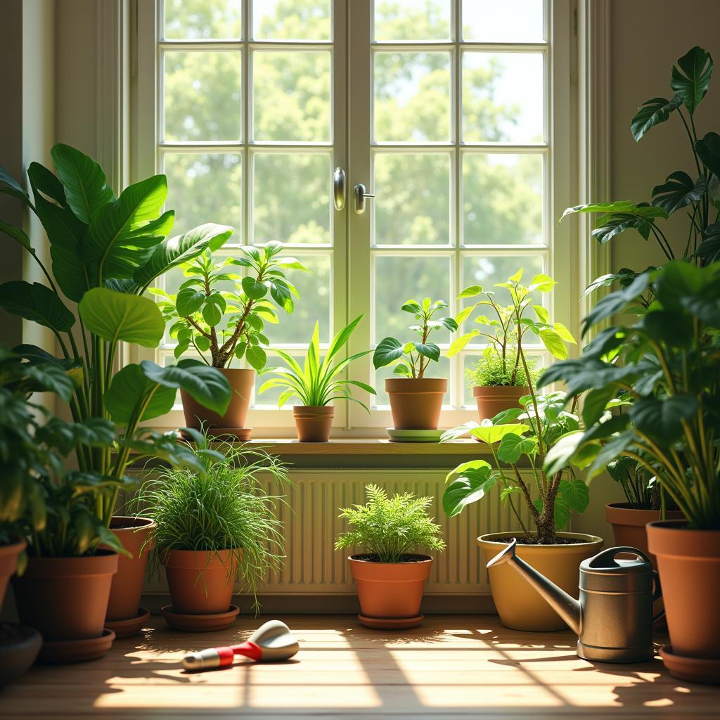 A realism photograph of a cozy indoor space filled with various houseplants basking in bright summer sunlight streaming through large windows, showcasing lush green leaves, a watering can, and gardening tools nearby, creating a vibrant and inviting atmosphere that highlights plant care. The sunlight creates playful shadows on the floor, revealing different plant textures.