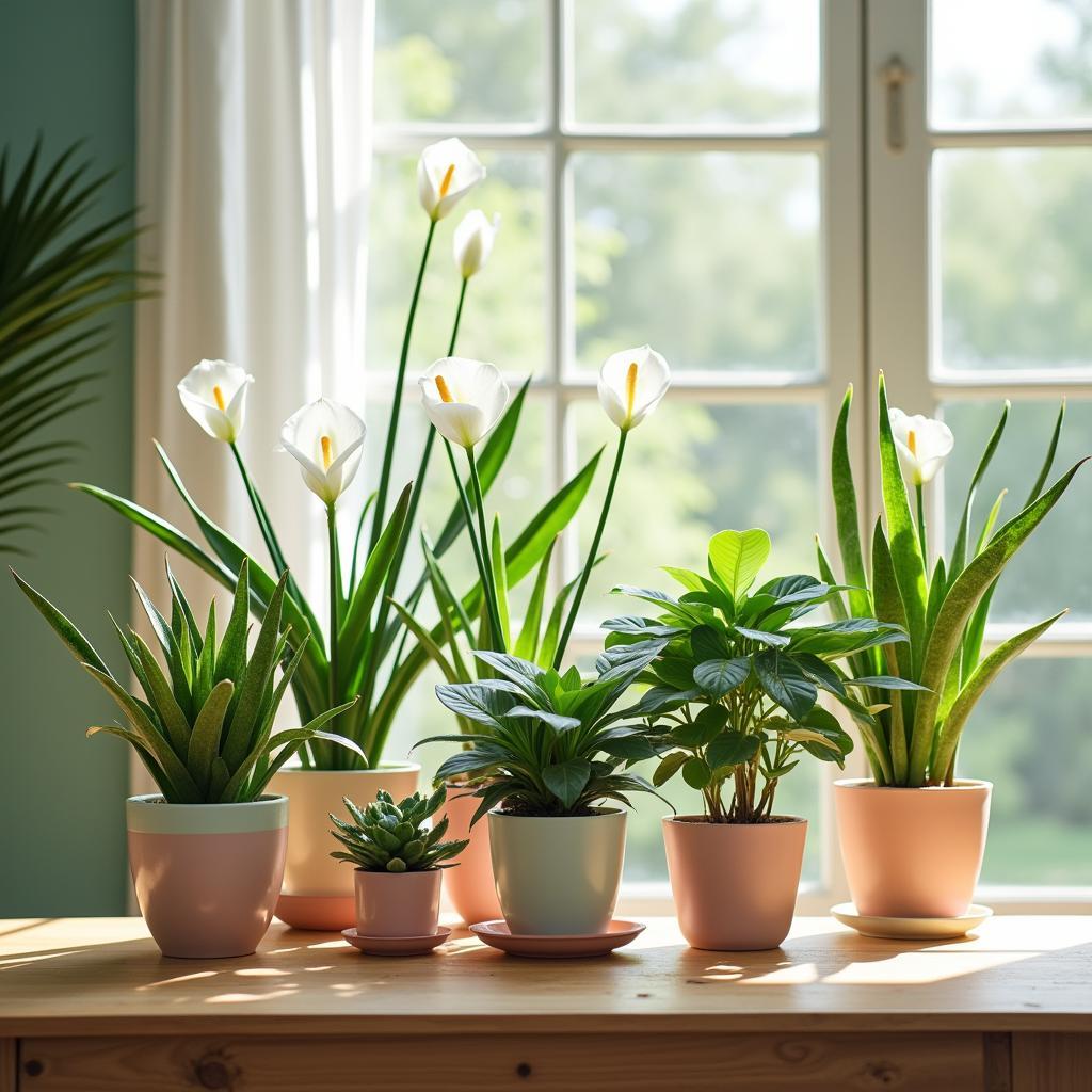 – Peace Lily: Known for its elegant white blooms and air-purifying properties, it thrives in low to medium light.