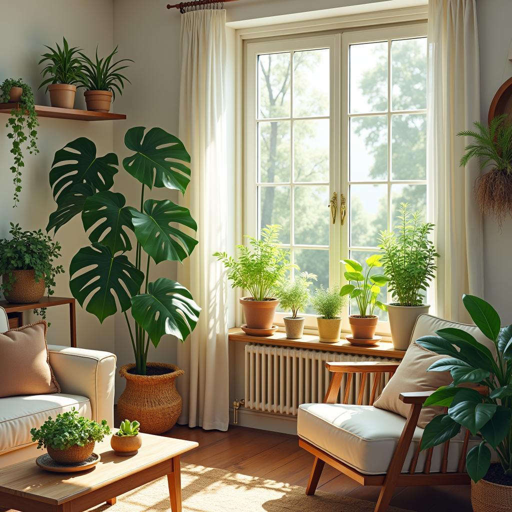 – Living Room: Larger houseplants like fiddle leaf figs or snake plants work well due to their size and air-purifying qualities.