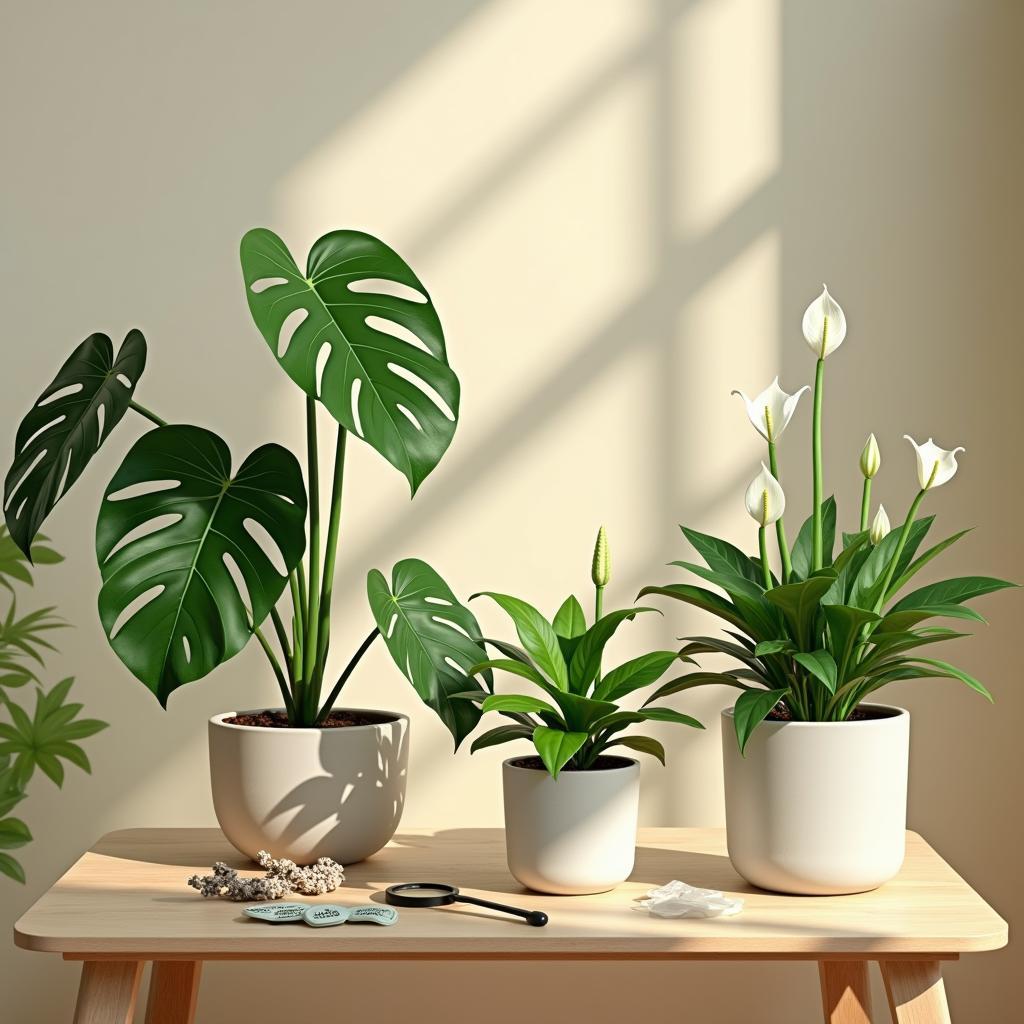 A realism photograph of an indoor plant setup on a light wooden table against a soft beige background. Display several houseplants, including a large green monstera, hanging ivy, and a smaller peace lily, strategically placed. Among the plants, include tools like a magnifying glass and sticky traps for pest management, with natural light highlighting the vibrancy of green leaves and the tenderness of soil. The scene should evoke a refreshing, tranquil, and organized space, illustrating the commitment of an indoor gardener.