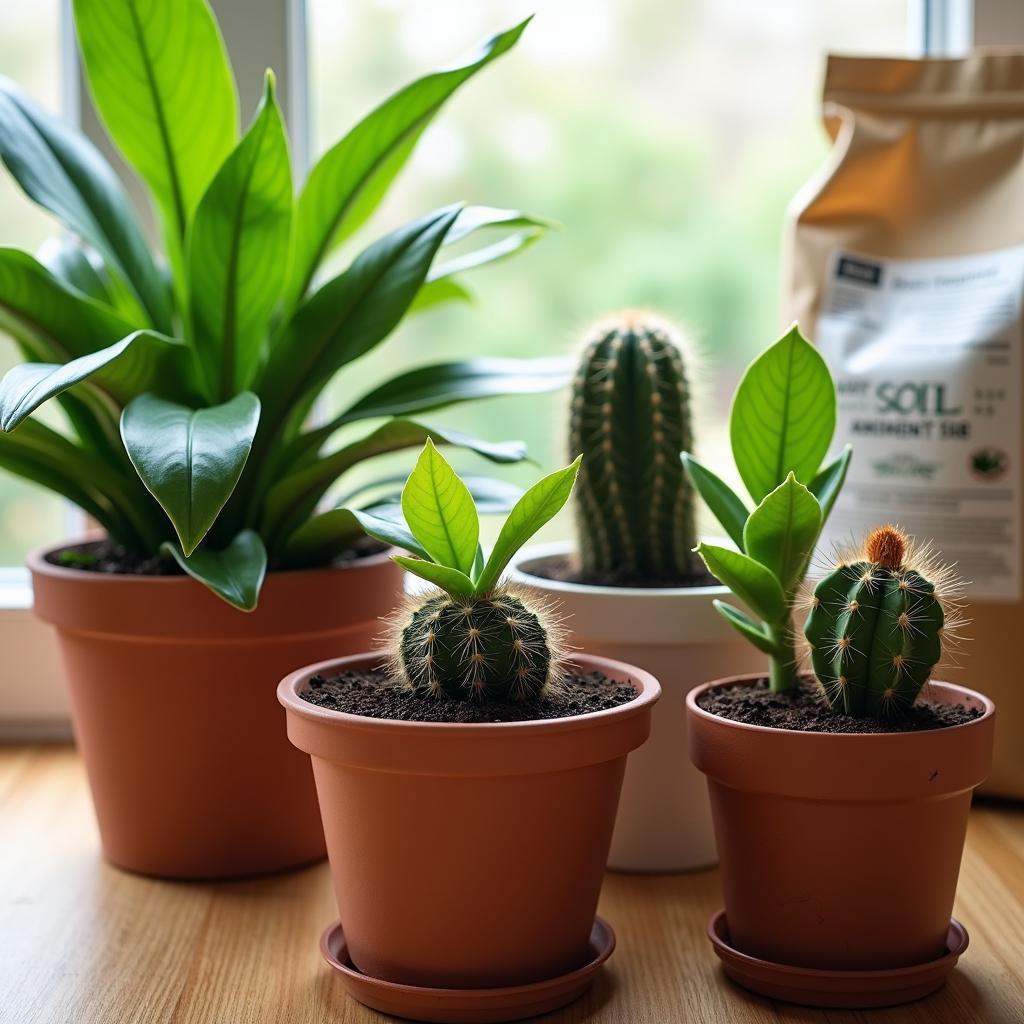 A realism photograph of several indoor plants with various pots showcasing different types of healthy soil. The plants include a Snake Plant, a Peace Lily, and a Cactus under bright natural light, highlighting the differences in their soil texture and colors. The background subtly includes a pH testing kit and a bag of soil amendment, emphasizing the importance of soil selection in indoor gardening.