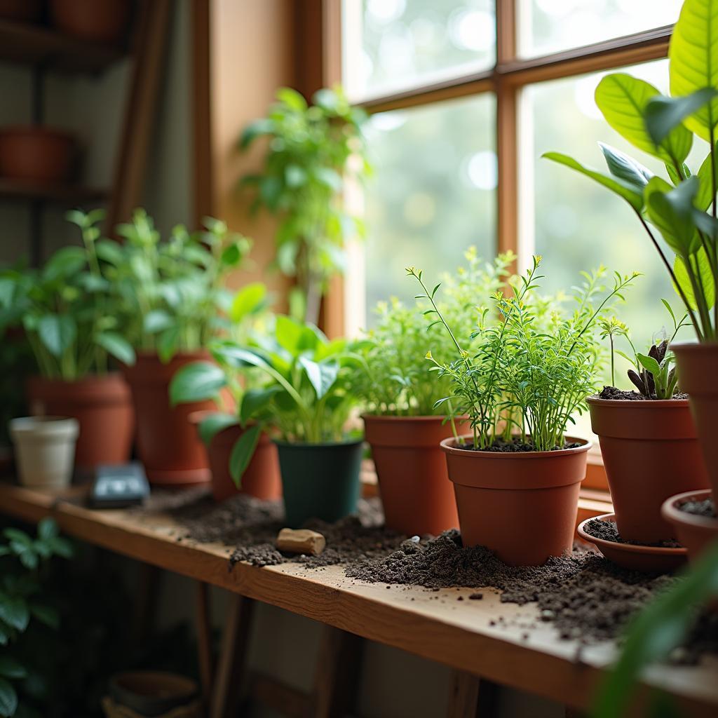 A realism photograph of an indoor gardening setup featuring various potted plants on a wooden shelf. The pots should be diverse in size, color, and texture, with some showcasing rich, moisture-retaining soil. Background elements like sunlight streaming through a window and gardening tools placed thoughtfully enhance the cozy feel of an indoor garden. This captures both the aesthetic and practical sides of indoor gardening beautifully.