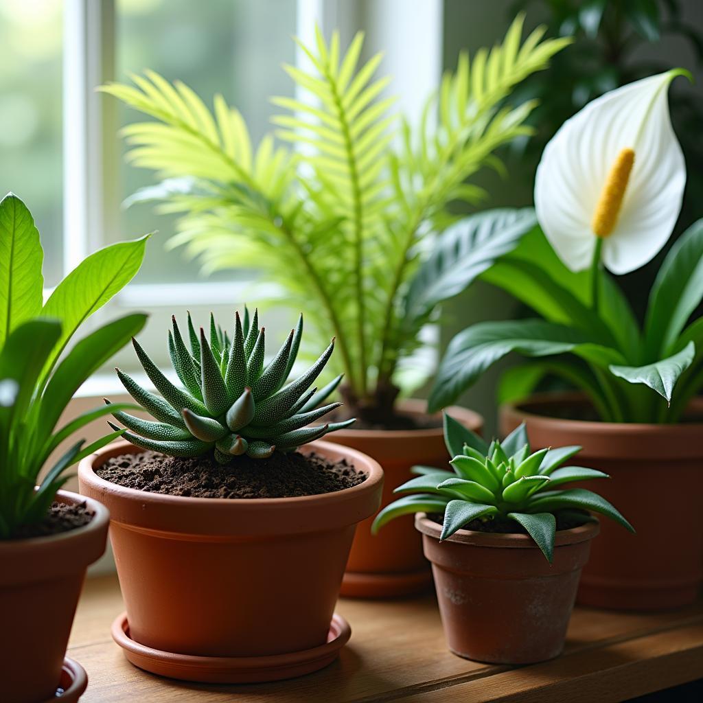 A realism photograph of a beautifully arranged indoor garden, showcasing various houseplants including a succulent in a terracotta pot, a fern with lush green leaves, and an elegant peace lily. The backdrop includes natural light streaming through a window, highlighting the different textures and colors of the plants, with rich, organic soil visible in the pots, emphasizing the importance of soil selection in indoor gardening.