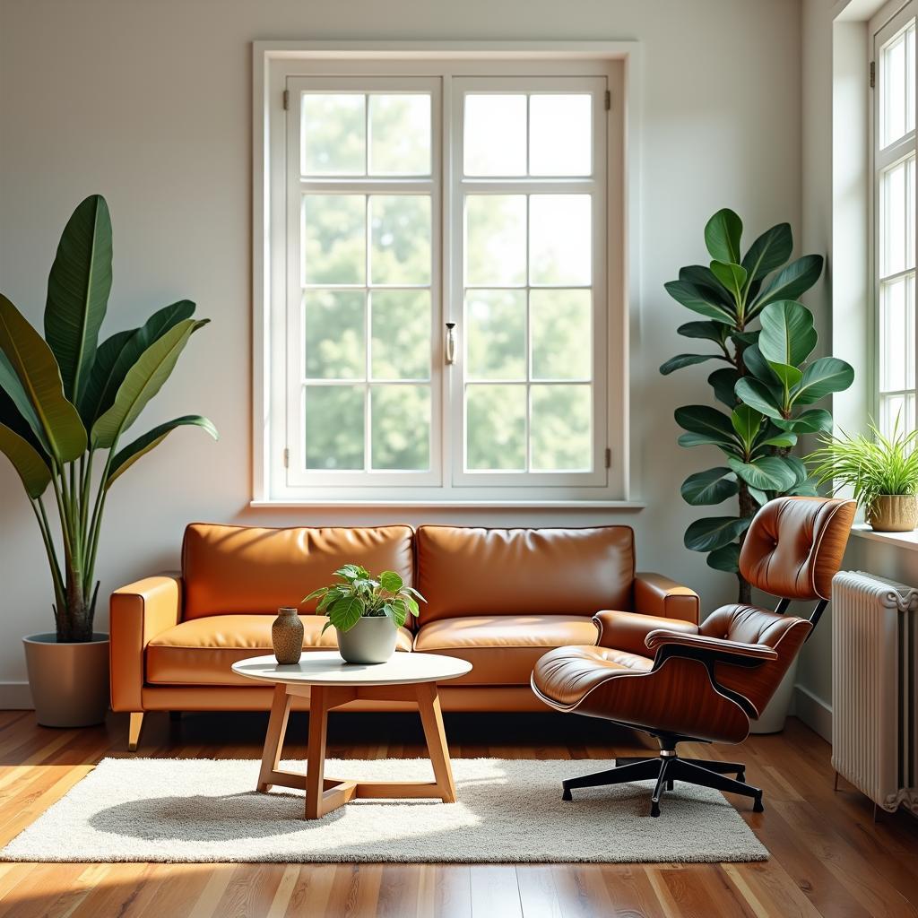 Example: Position a tall Rubber Plant in a sleek ceramic pot near a wooden Eames lounge chair for a beautiful contrast.