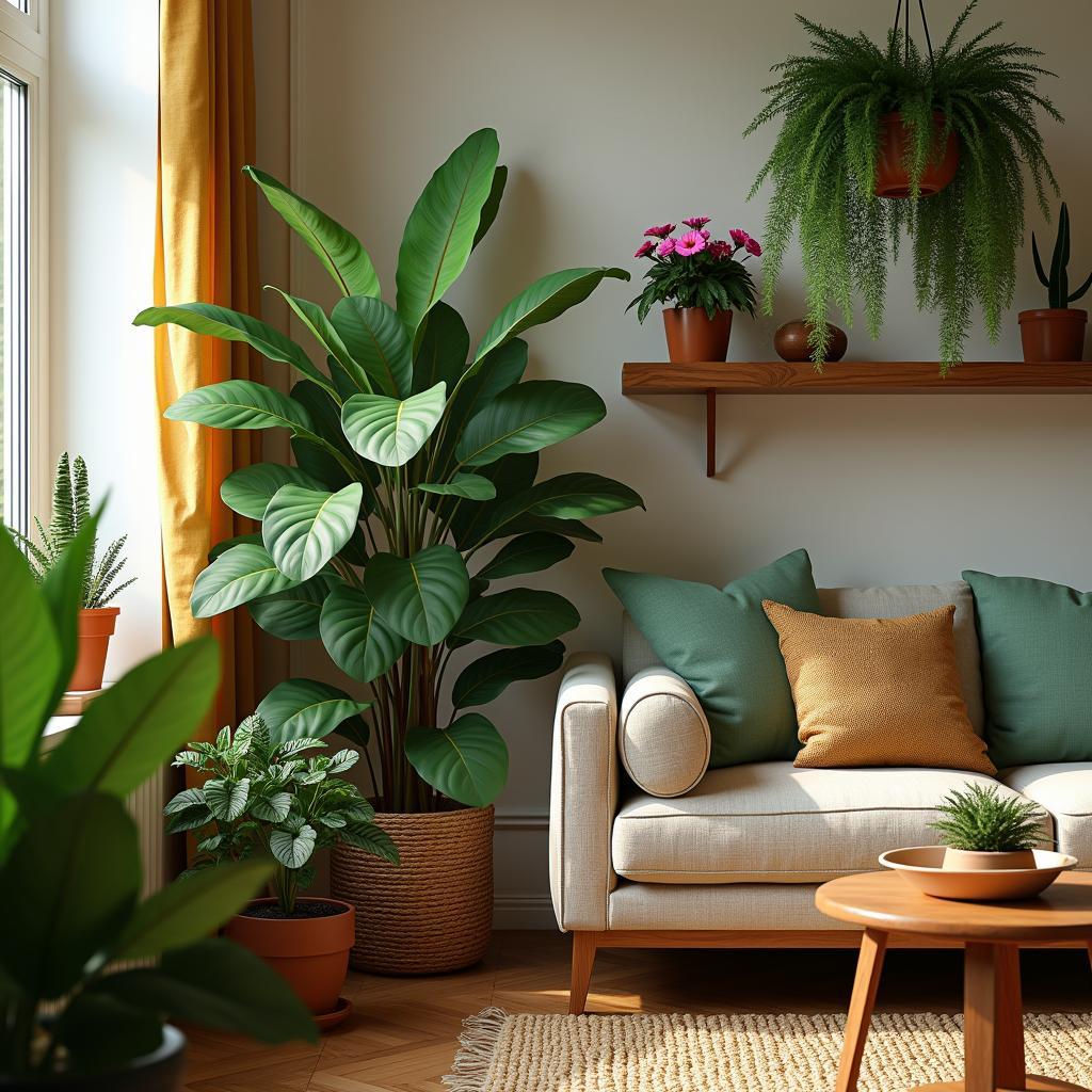 – Flowers: Bring pops of color but require more care and are often seasonal. They can act as striking centerpieces in a room.