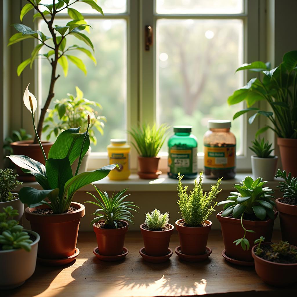 A realism photograph of a well-arranged indoor garden featuring various potted plants, including a peace lily, snake plant, and succulents, displaying different types of soil amendments and fertilizer bottles in the background, illuminated by natural sunlight streaming through a window, creating a warm and inviting atmosphere.