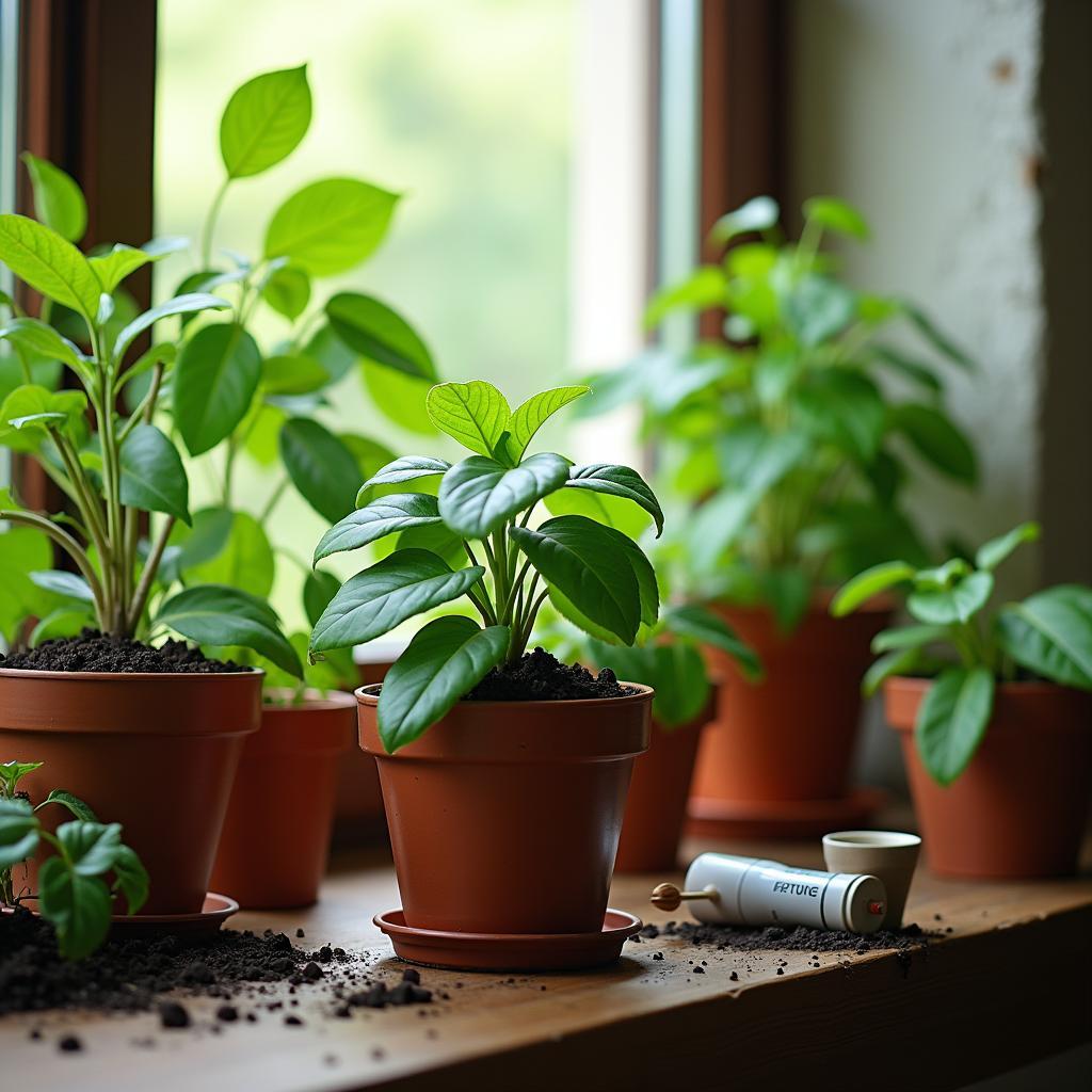 A realism photograph of a cozy indoor garden setup featuring a variety of lush green plants in beautifully arranged pots. The scene includes pots with rich, dark soil, emphasizing soil texture and health. Soft, natural light filters through a nearby window, illuminating the vibrant leaves and creating an inviting atmosphere. A small plant care kit with soil testing tools is placed nearby, symbolizing the importance of nutrient testing.