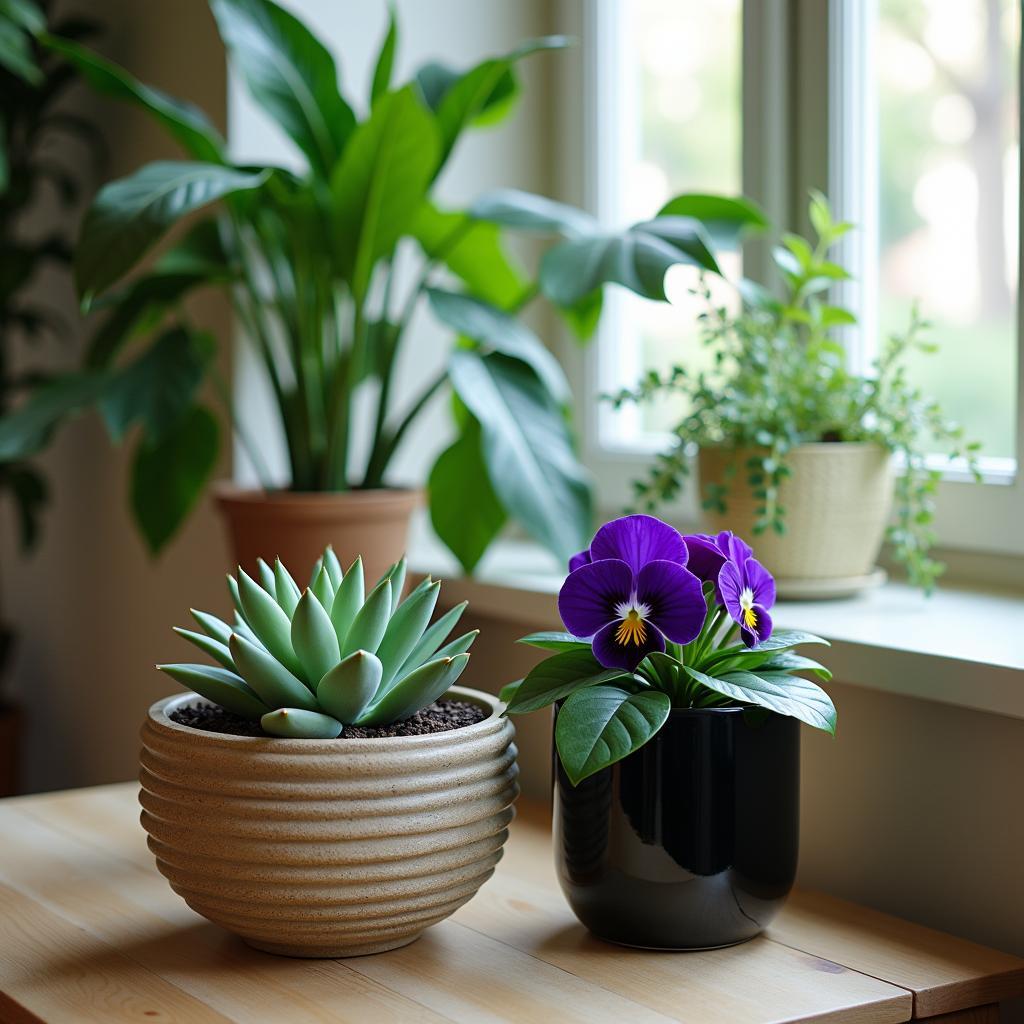 A realism photograph of a cozy living room corner featuring a variety of indoor plants styled in decorative pots—an Echeveria in a textured ceramic pot, a vibrant flowering African violet in a glossy black pot, and a tall, leafy Monstera Deliciosa against a window. Soft natural light illuminates the scene, emphasizing the beauty of the textures and colors, creating a calm and inviting atmosphere.