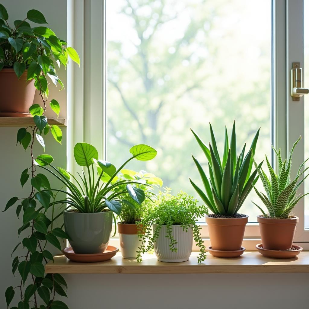 “A realism photograph of a beautifully arranged indoor plant shelf, showcasing a variety of vibrant green plants in decorative pots. The shelf is positioned against a light-colored wall and features a mix of trailing and upright plants with varying textures and heights. Soft natural light filters in through a nearby window, casting gentle shadows. Each pot is distinct, adding a personal touch to the overall aesthetic of the space, creating an inviting atmosphere suitable for beginners and seasoned plant lovers alike.”