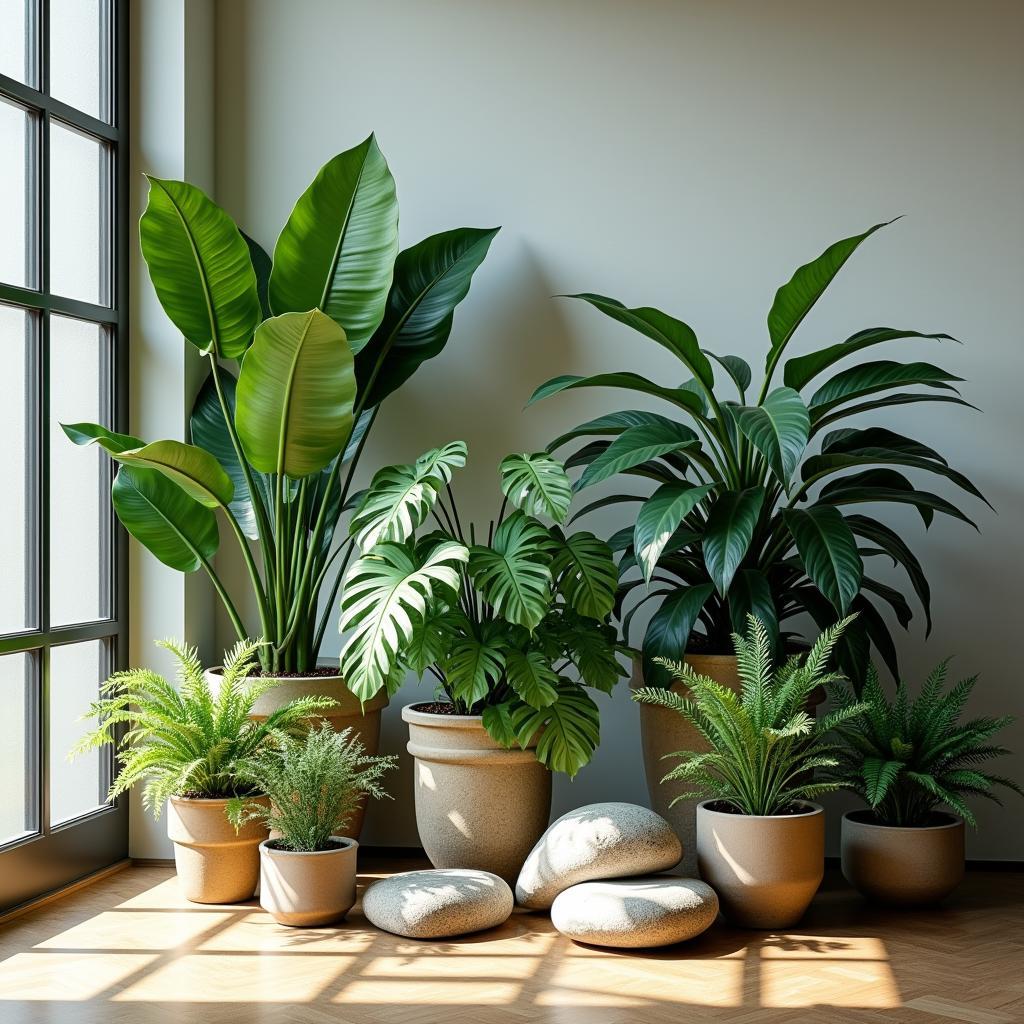 Example: Arrange a striking bird’s nest fern in a textured ceramic pot and surround it with smooth river stones.