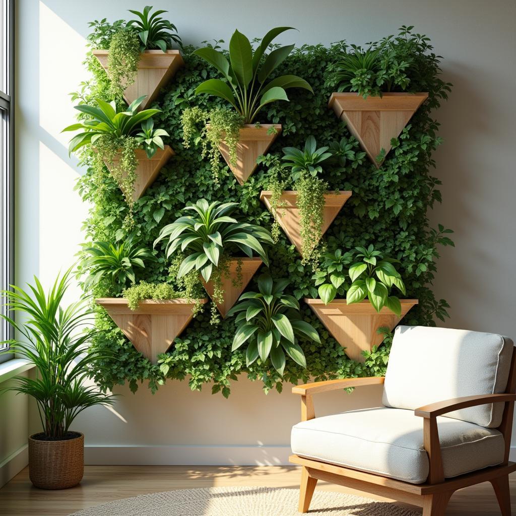 A realism photograph of an indoor vertical garden that showcases a variety of lush greenery cascading from geometric wall planters in a sunlit room, highlighting different textures and colors of plants along with natural wood shelving for contrast, bringing a fresh and vibrant atmosphere to the modern living space.