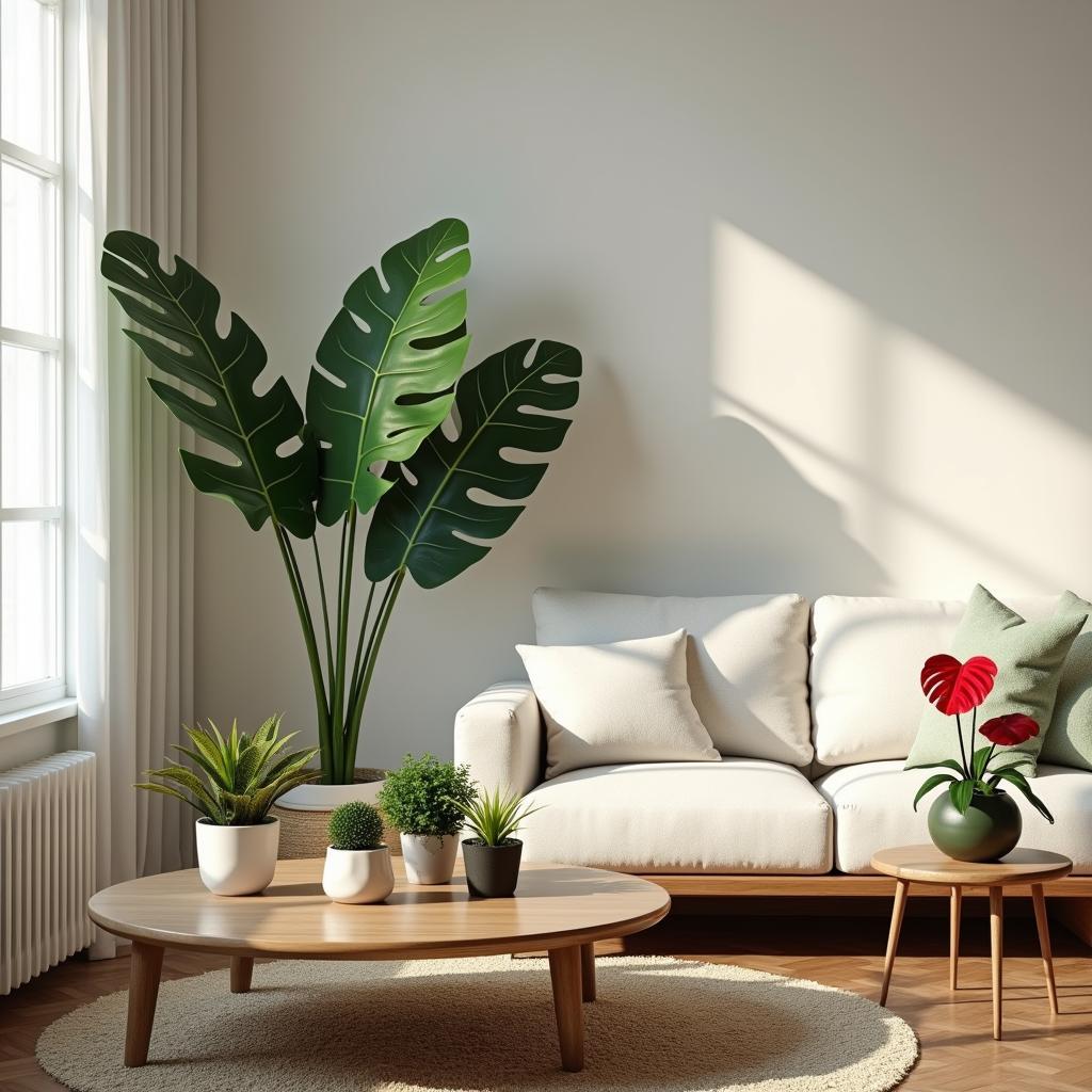 A realism photograph of a modern living room filled with stylish indoor plants. The image should feature a large fiddle leaf fig placed next to a minimalist white couch, an assortment of smaller plants on a wooden coffee table, and a vibrant red anthurium on a stylish side table. The warm lighting should enhance the richness of the green leaves against the neutral background, showcasing how these plants elevate the decor.