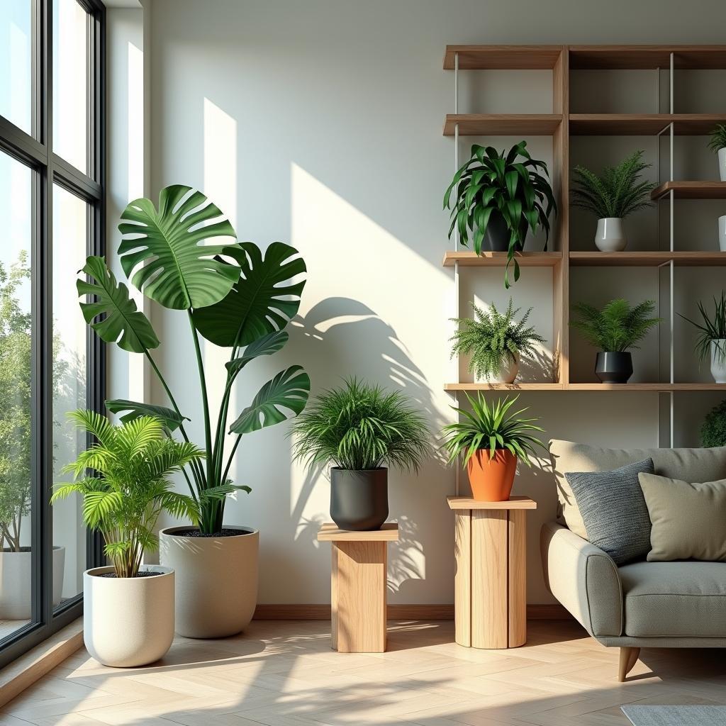 For a bright room, consider featuring a tall monstera plant to draw the eye upwards, while using smaller ferns on a shelf for contrast.